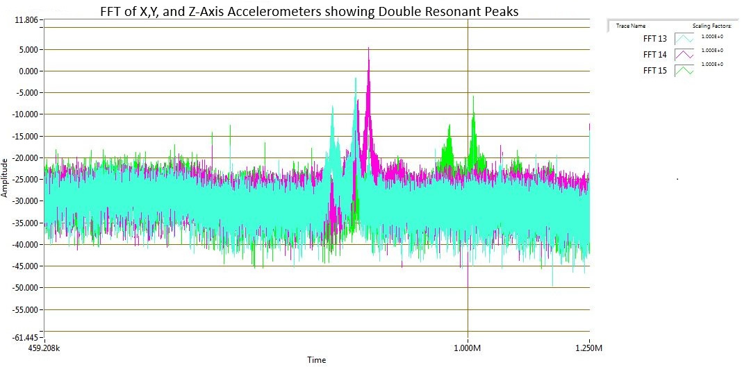 Mecalc ALI25 - Sample of FFT resonant frequencies from a triple-axis block arrangement.